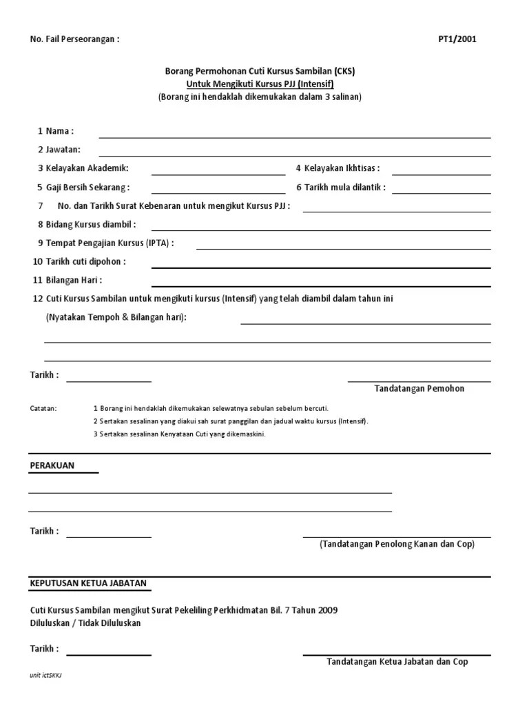 Permohonan cuti kursus sambilan (cks) untuk mengikuti pjj ( kuliah/tutorial/seminar/bengkel/koloktum/latihan amali/latihan industri ) (hendaklah diisi dalam 2 salinan). Tafsiran cuti sebarang tempoh seseorang pegawai itu dibenarkan meninggalkan tugasnya dan peninggalan tugas itu tidak dikira sebagai putus. Pt7/2001 (pindaan 2013) borang permohonan cuti kursus sambilan (cks) untuk mensikuti kursus pjj (lntensif) Borang cuti tanpa rekod kursus intensif. Borang smart card untuk kad matriks >> sini 3.